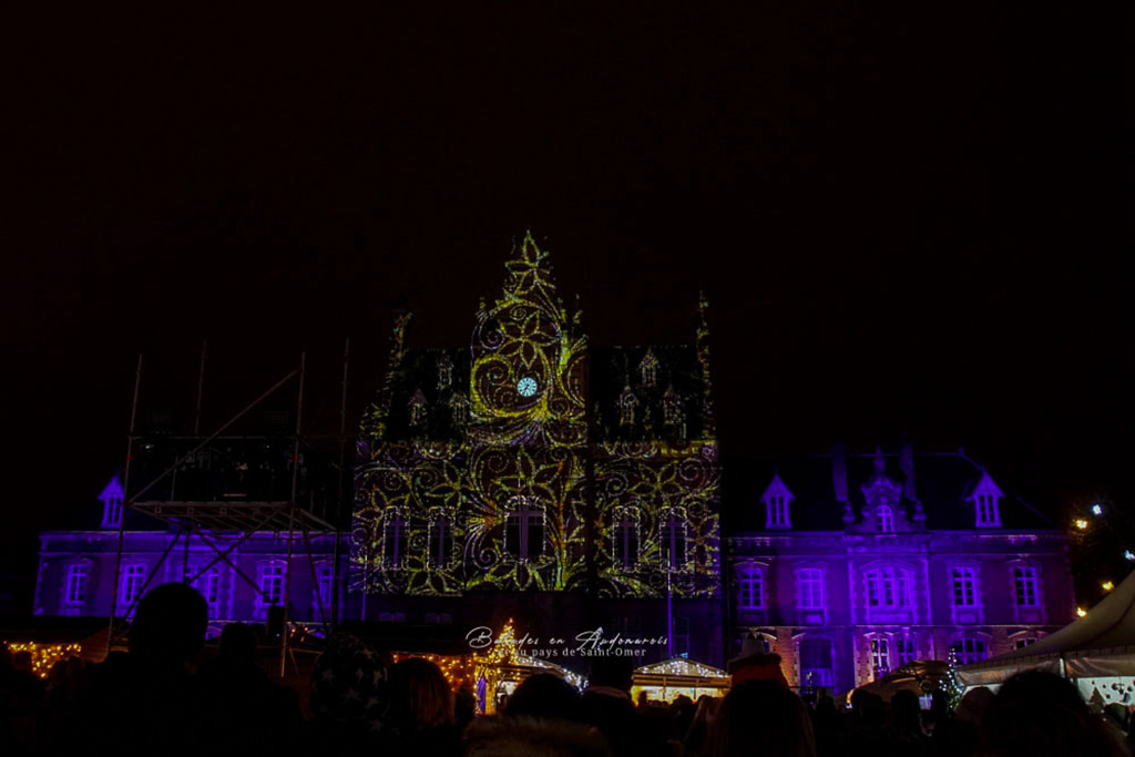 La projection vidéo-mapping marché de Noël Arques 2021 venait prolonger l’expérience en soirée, attirant le public vers la mairie pour assister à un spectacle lumineux sur façade.