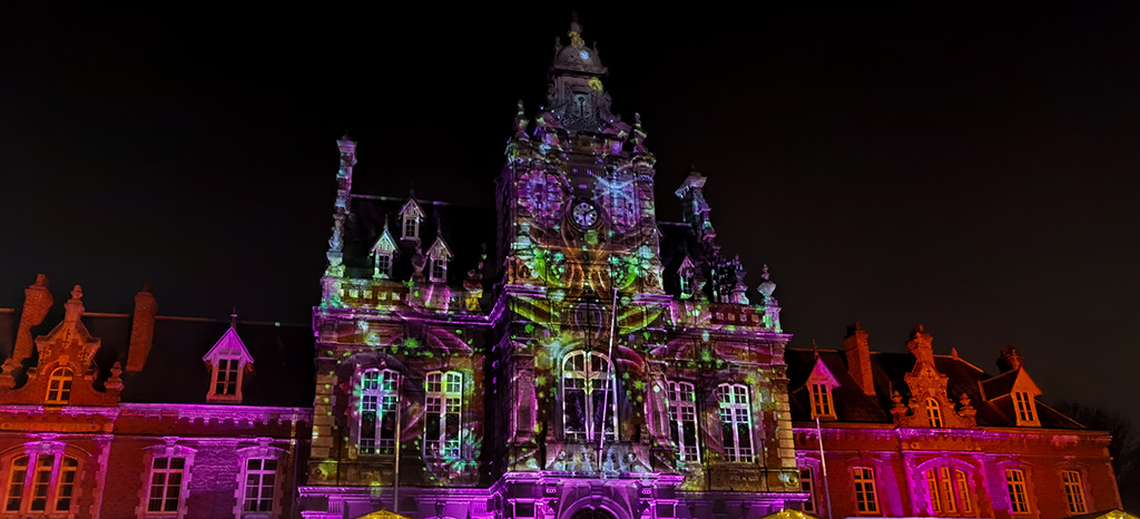 La projection vidéo sur la mairie d’Arques a été conçue spécifiquement pour l’architecture du bâtiment.